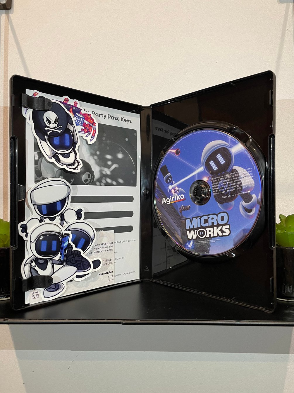 A physical copy of MicroWorks, 3 Party Pass keys and 5 custom designer stickers.